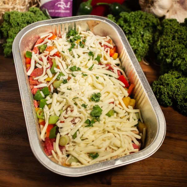 Strips of tender lean 100% Scotch Beef with a creamy peppercorn sauce, with red onions, red & yellow peppers then topped with grated mozzarella cheese.